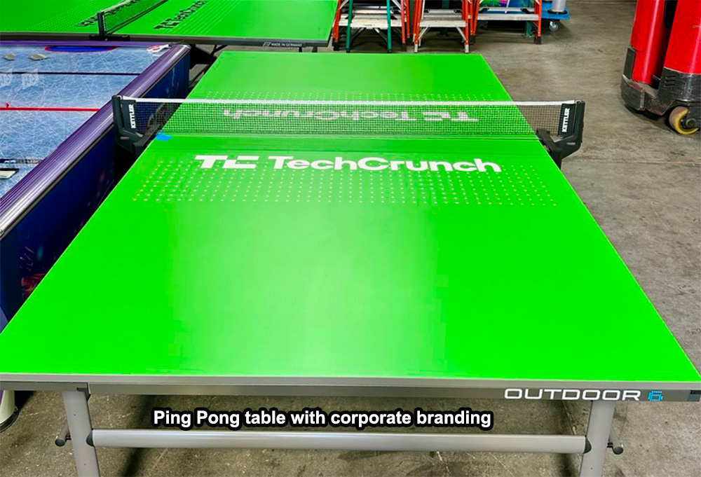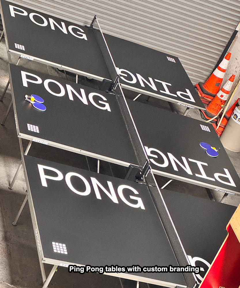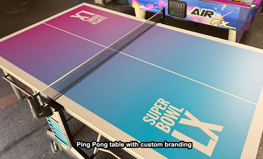 Ping Pong and Table Tennis tables for rent can be branded or personalized with corporate logos or graphics for a specific event. For further information, please contact our Arcade Party Rental professional staff to learn more about branding and customized wrapping and the process and steps involved in creating custom graphics and wraps.