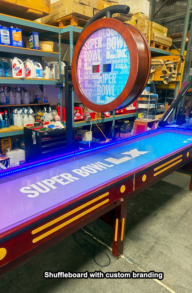 Rented Shuffle Board Tables come made with an exceptionally slippery playfield made out of a 3-inch maple wood butcher block with a smooth polymer surface and covered with silicone wax (sometimes called sand) to reduce friction. All tables come with an oversized 24-inch handcrafted cherry wood electronic scoring unit.