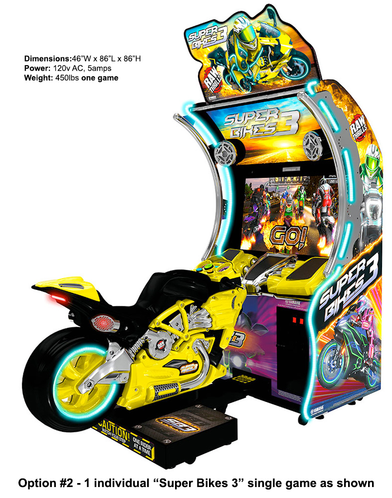 Super Bikes 3 Motorcycle Racing game can be rented as two linked single cabinets (Option #1) or as an individual (one) single cabinet (Option #2).