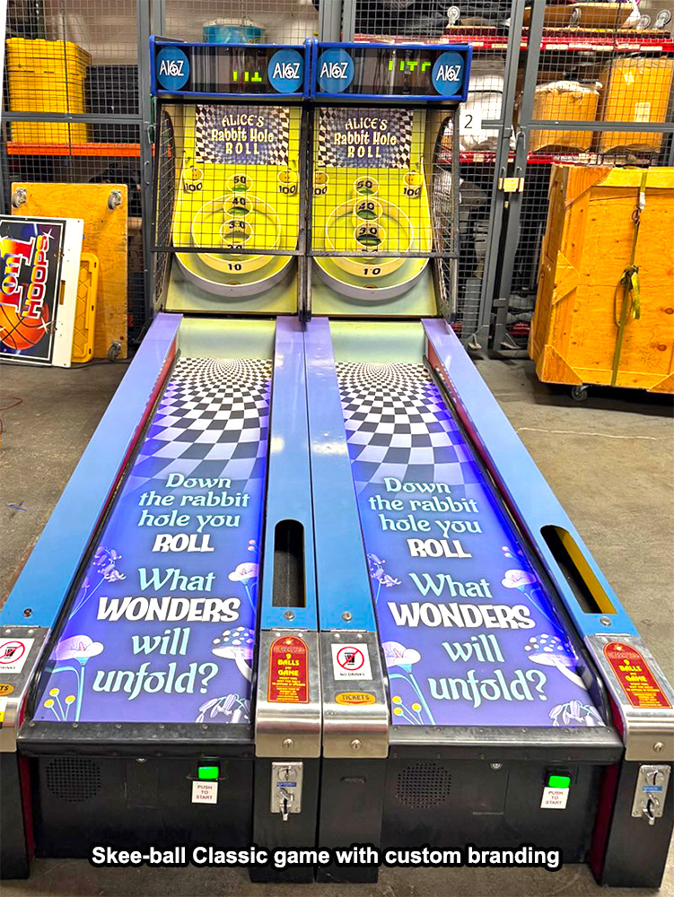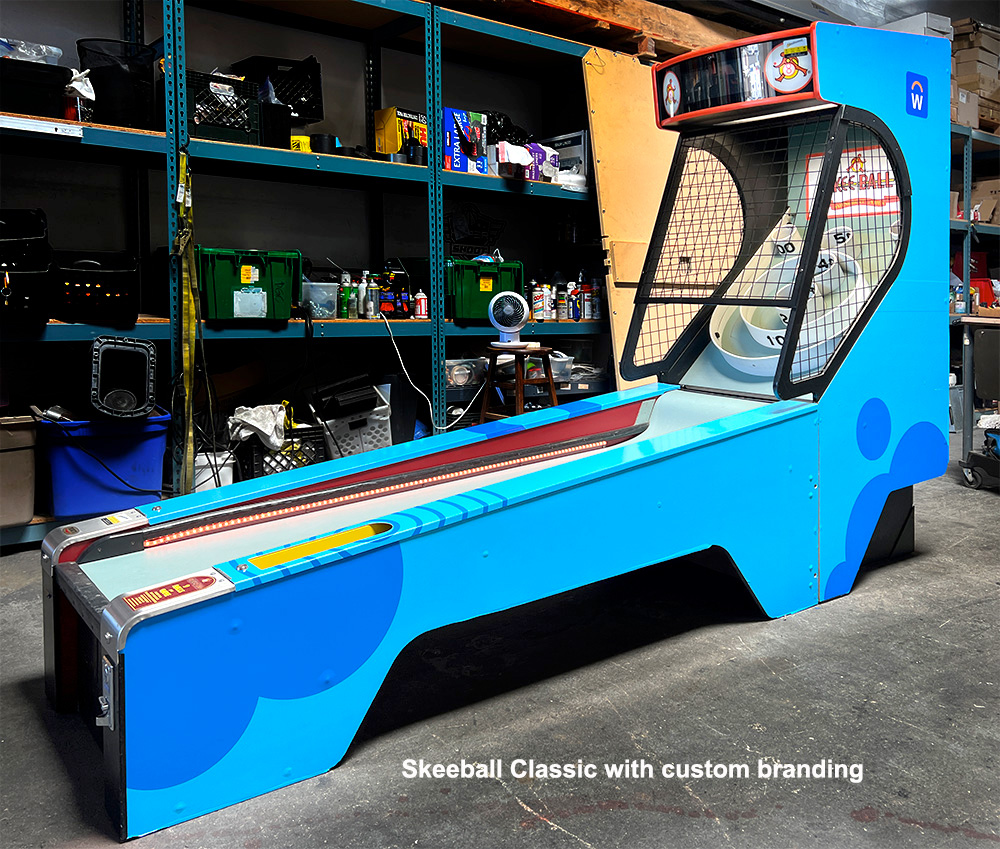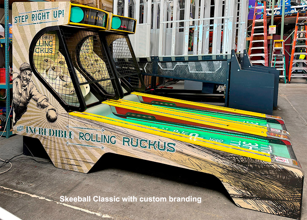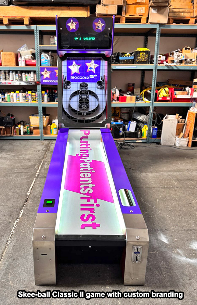 Our graphic team can customize Skeeball/ Skee-Ball alley games with your company logo or custom graphics to make your company stand out at any event or trade show. To further enhance the attractiveness of the rented Skeeball Classic Arcade Games, we offer optional colorful marquee that can be installed on a single or multi-game setup.