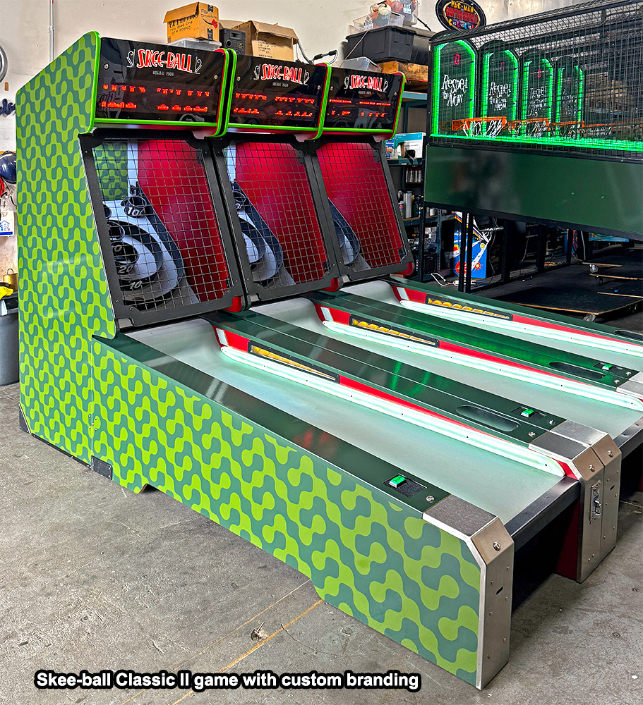 The Skeeball Classic II alley features a range of modern enhancements, including an updated cabinet design, an improved ball dispensing system, and upgraded electronic components.