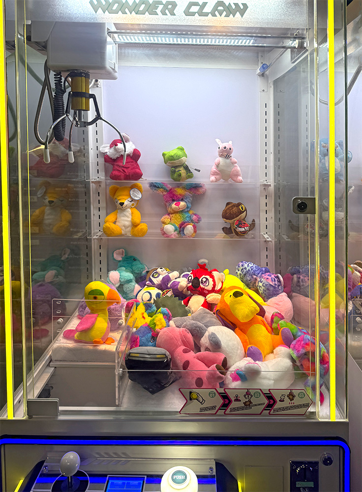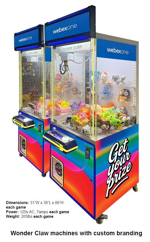 Built with a sleek, contemporary cabinet, the Wonder Claw Crane Machine features nine customizable lighting modes, a programmable video marquee for branded messaging, and adjustable display shelving that showcases prizes in an eye-catching way. The machine supports items ranging from 6” to 12” in size and up to 16 oz., offering flexibility for a wide variety of promotional products.