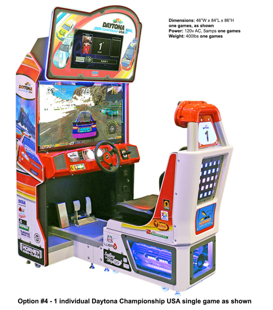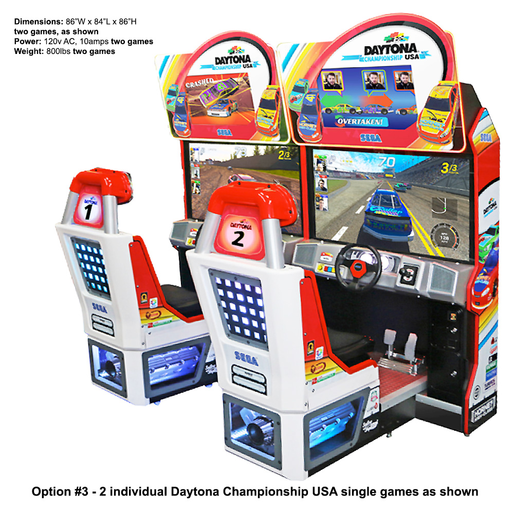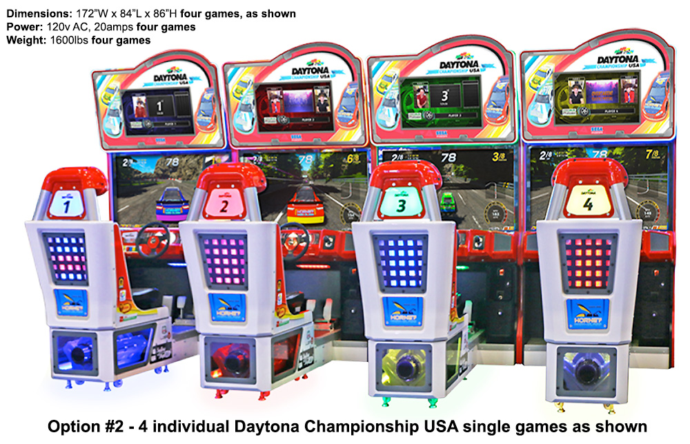 Daytona 3 Championship USA Racing Video Game can be rented as eight (8) linked single games (Option #1) or as four (4) linked single games (Option #2) or as two (2) linked single cabinets (Option #3) or as an individual (1) single game (Option #4).